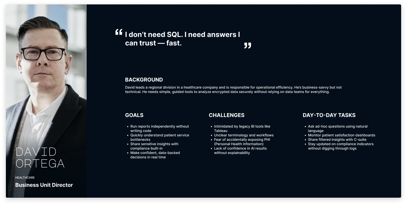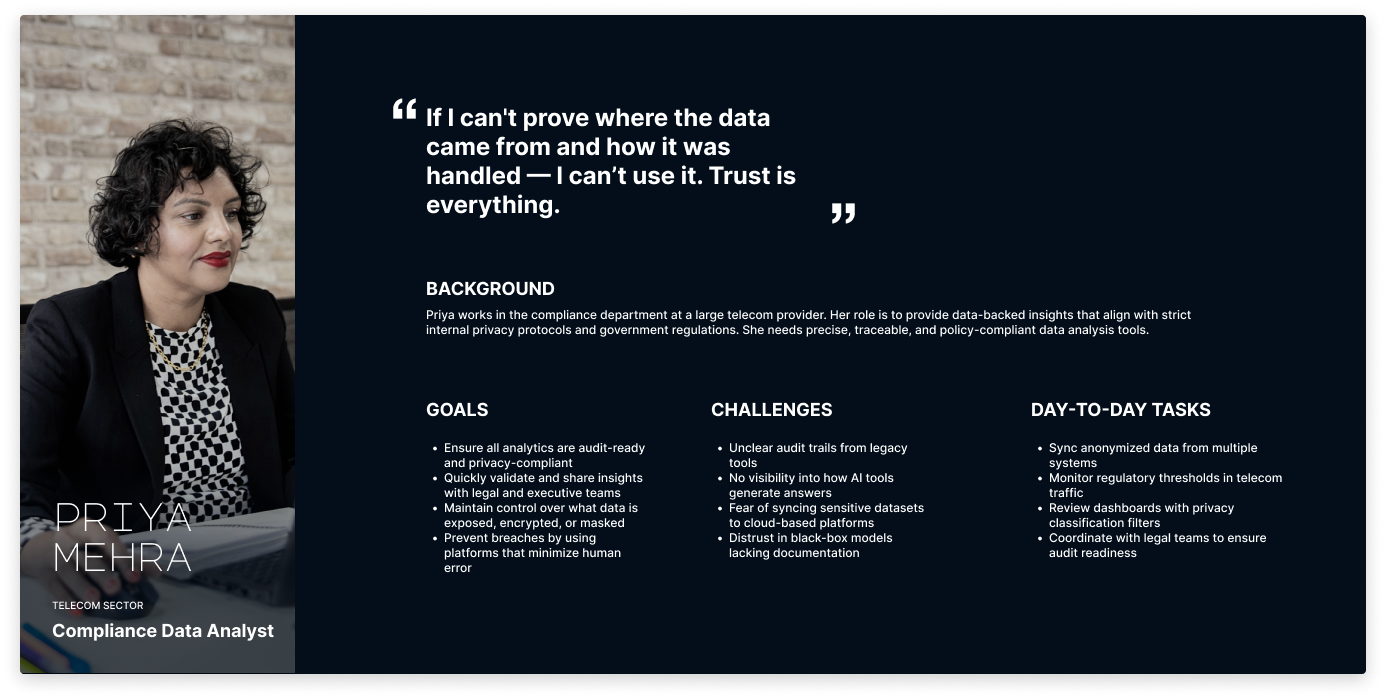 First, the Compliance-Focused Analyst is responsible for syncing sensitive data, ensuring encryption standards are met, and validating insights before reporting. Next, the Non-Technical Decision Maker relies on natural language inputs and dashboards to make fast, informed decisions without deep technical involvement. Lastly, the Enterprise IT Architect oversees system integration, privacy protocols, and long-term scalability—ensuring that any solution meets internal and regulatory requirements.