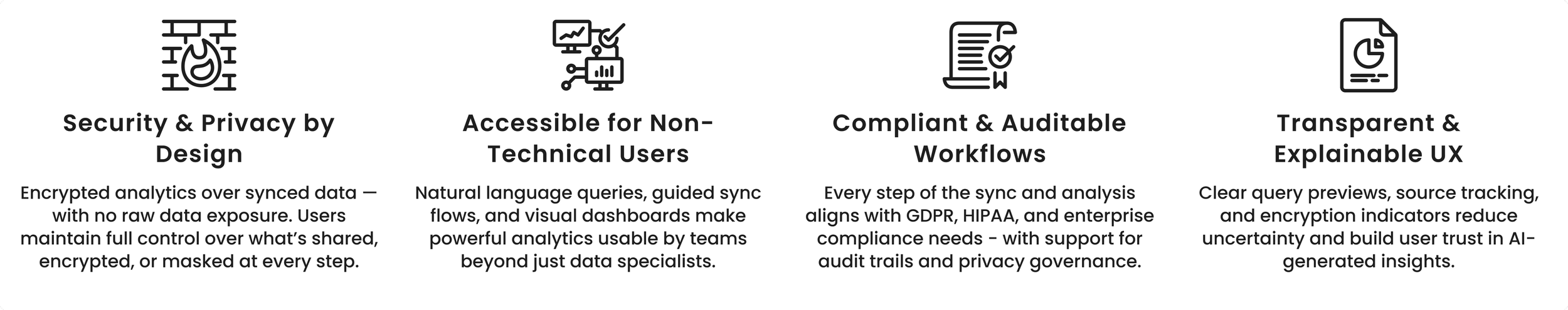 To solve the pain points of secure analytics in high-compliance environments, we designed a user-centered experience that balances privacy, usability, and speed.