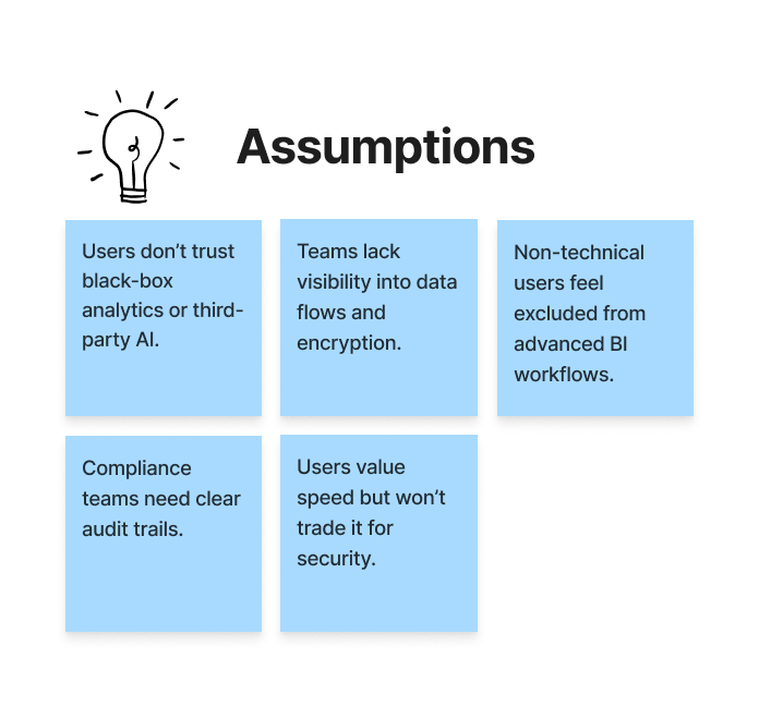 To create a product that solved real problems for privacy-conscious organizations, we needed to deeply understand user workflows, trust barriers, and compliance constraints. We began by aligning on key research questions, challenging our assumptions, and identifying actionable insights.