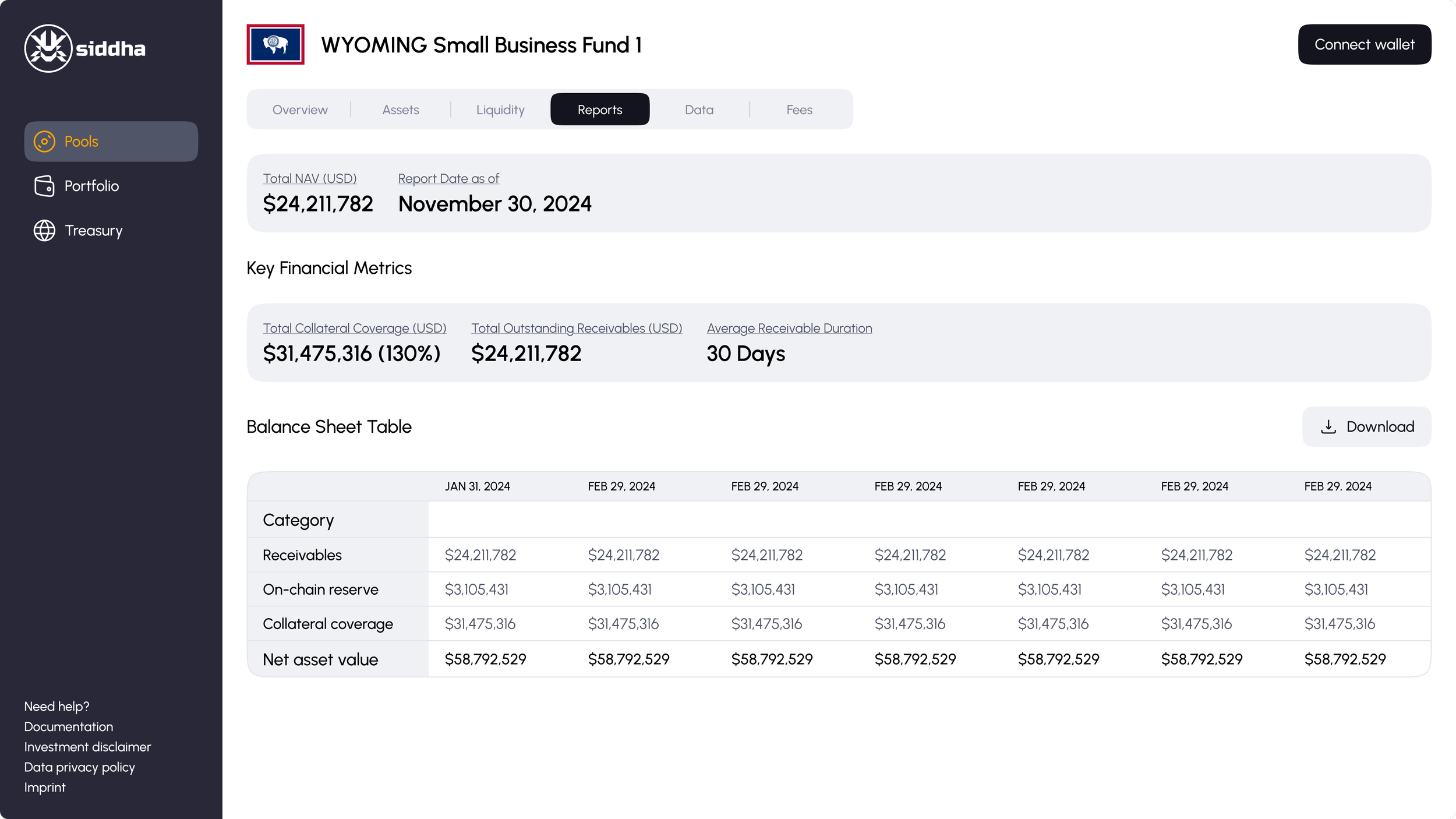 Tabs: Overview, Assets, Liquidity, Reports, Data, Fees